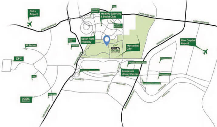 The owner company, Beta Egypt Developments, was interested in implementing Beta Greens Compound in a unique strategic location close to the main roads and direct axes that facilitate access for owners, as the location of Beta Greens New Cairo Compound is distinguished by being located in the heart of the city of the future and next to vital places and main roads, as the project is surrounded from the north by the Suez Road and on the left by the Middle Ring Road, while on the right by the Regional Ring Road, and the most important features of the location are the following: