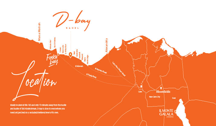 D Bay North Code project is ideally located on the North Coast at kilometer 165 Alexandria/Matrouh Road. Specifically in Dabaa area in front of Dabaa axis. The resort is located in a very vital area, in the middle of the largest tourist resorts there, so it is close to everything you need, as follows: