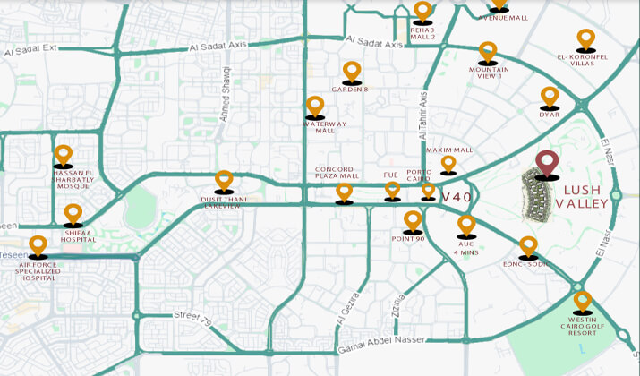 Location plays a major role in choosing a home. For this reason, City Edge Developments established Lush Valley New Cairo Compound in the heart of the 5th Settlement. This strategic location allows residents to reach key destinations quickly and without stress. Furthermore, the compound sits close to major roads, axes, and vital hubs. As a result, residents avoid long commutes and traffic congestion. At the same time, the area maintains a calm and upscale residential atmosphere. As well as teh location is near the Places to Lush Valley Compound: