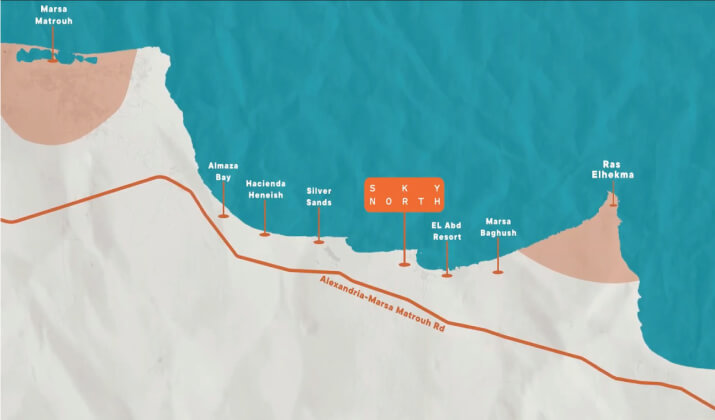 The prime location is one of the elements that matters to clients, so we at Sky AD Developments chose to lay the foundation of Skynorth in one of the most strategic locations on the North Coast, specifically in Abd Resort Kilo 246. Which will reflect positively on the easiest accessibility for owners and their families, as the village is near many major destinations, as follows: